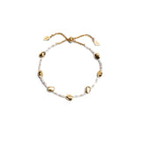 This pull-tie chain bracelet features hand-strung glass beads and is accented with seed-like 18K gold-plated stainless steel beads. The adjustable rope chain ensures a perfect fit, tightening to 6.25” and extending up to 10”.