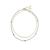 Eden's Garden of Eden Necklace Set in gold features two layered necklaces: one hand-strung with mixed green glass beads and organically shaped 18K gold-plated stainless steel beads, the other, a 16.25” gold-plated chain. Both include a 1.3” extension chain for adjustable length.
