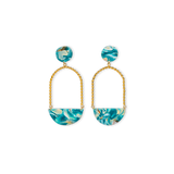 Eden's Water Spring Earrings symbolize the resilience of Burmese girls, much like desert flowers. These earrings boast a handcrafted 0.6" diameter polymer clay on a 316 medical-grade stainless steel post. Dangling elegantly is a 2" pendant made from 18K gold-plated stainless steel and handcrafted semi-circular polymer clay pendant. Both the post and pendant are mixed teal adorned with gold foil.