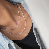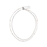 The Garden of Eden Necklace Set in stainless steel pairs two layers: one necklace hand-strung with glass beads and freshwater pearls, the other in a sleek 16.25” stainless steel chain. Both are finished with a 1.3” extension chain for adjustable length.