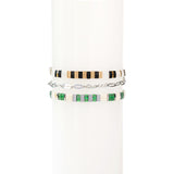 The Statement Bracelet Stack is a reminder of Eden’s mission to be light, bring hope, and share love. It is a stack of the 7.5" stainless steel "HOPE" chain with 1.3" extension chain and two hand-strung elastic bracelets. One with white glass beads, matte black glass beads, gold-coated glass beads, and an 18K gold-plated stainless steel bead engraved with "LIGHT" and the other with ivory glass beads, green glass beads, silver-coated glass beads, and a stainless steel bead engraved with "LOVE".