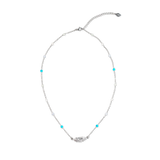 0.27" by 0.75" Rhodium-plated brass feather pendant set with white cubic zirconia hanging on 16" long stainless steel chain with a 2" extension chain. Chain is adored with natural turquoise beads, aventurine quartz beads, blue lace agate beads and fresh-water pearls.