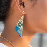 The Parting Waters Drop Earrings feature an 18K gold-plated stainless steel star post (0.4”), paired with a layered drop: an 18K gold-plated stainless steel pendant suspended over a hand-crafted blue polymer clay drop (2.5” x 1”) in mixed blues.