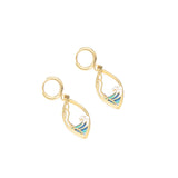 The hinged pendants feature a striking design with white and two-tone blue enamel, each measuring 1.1" in length. They are made of 18K gold-plated stainless steel complemented by 0.5" hinged huggie hoops made of 316 medical-grade 18K gold-plated stainless steel.