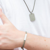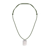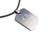 Eden's Waymaker Necklace features a military green polyester cord and a matte-finished stainless steel pendant engraved with “Waymaker” in braille. It’s fully adjustable up to 32”.