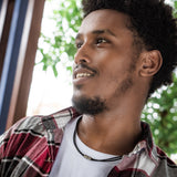 The four hexagonal beads on Eden's Find Hope Leather Necklace celebrate the steps David took to become free from human trafficking with engravings of the words "HOPE", "WAIT", "RISK", "SEEK", "CALL" and "FREE". It comes in black genuine leather with natural stainless steel hardware and is 20" in length with a bayonet clasp.